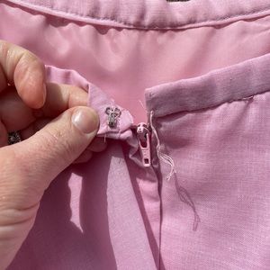 This is an amazing vintage 70’s baby pink prom dress. Elastic top with straps underneath allowing to wear on the shoulders or off. Zipper back. As shown in the pic there is the hook to the eyelet at the top but the thread to hook onto has come off. Ribbon tie at waist. Ruffled bottom. Fully lined. In fantastic condition. Best fits an XS- small. Please refer to measurements (these are approximate): pit to pit 17.5”, waist 14” and length 56”