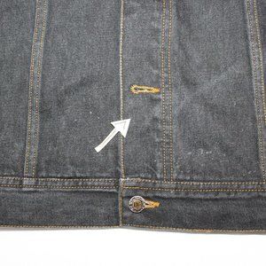 **Note: Measurements in pictures. Missing a button in the front - see pic. 100% cotton, 2 button front pockets, adjustable sides, embroidered person on the back jacket. Also, name of some person on tag. See all the pictures for details.