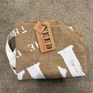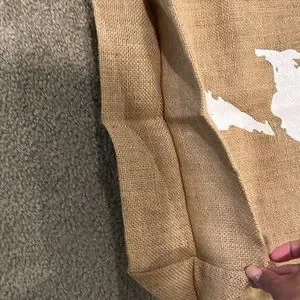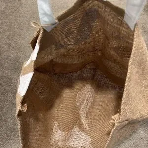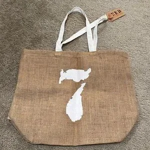 Color: Natural brown with white text Material: Burlap with cotton handles