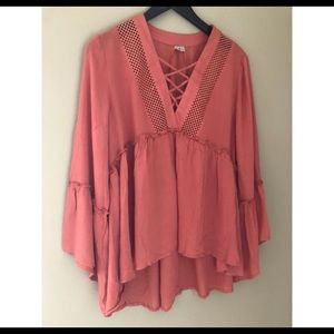 Perfect year round! Rust color bell sleeve top features criss cross front with embroidered detail. Gauze like rayon material.