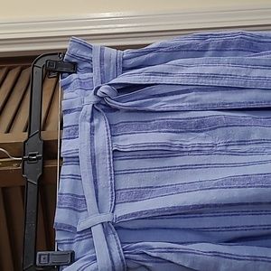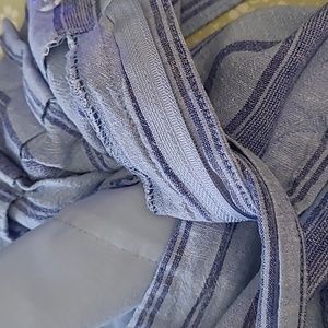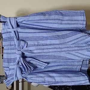 55% Linen 45% Rayon.Cool and comfortable, high-rise, and loose legs. Waist across front 14 1/2 with lots of stretch hidden elastic in the back, 14 inch stride, and 4 inch inseam. lining for pockets is soft blue fabric, and the zipper is blue as well. Oversized fit.