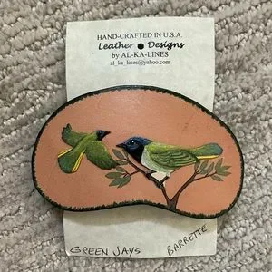 Hand-crafted leather barrette. Hand cut and hand painted Green Jay (Bird) leather barrette with metal clasp.
