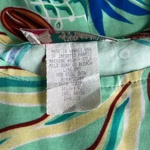 Beautiful aquatic colors jade, blue brown - Hilo Hattie made in Hawaii Dress. Like new - worn once. 100% rayon challis - dry clean. Front waistline wrap ties to the side.