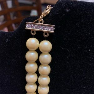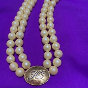 Vintage Avon cream faux pearl double strand necklace created for representatives reaching the elite level of Honor Society. Oval pave center has HS engraved on the back. 16.5” long with 3.5” extender