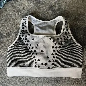 FABLETICS SPORTS BRA STARS & STRIPES BLACK & LIGHT GREY EXTRA SMALL XS. Was worn once but tags were removed so don’t know if it is small or extra small, I included pics with measurements and a pic showing the difference in size to a size 6 Fabletics top. Please ask any questions prior to purchases Bin-A.