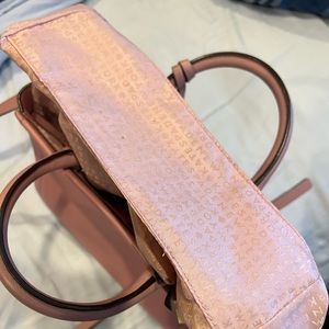 KATE SPADE PINK/MAUVE CROSSBODY HANDBAG LEATHER WITH DETACHABLE STRAP & FOLD IN HAND STRAPS. Is in good used condition, color is mor mauve like in the stock photo. Hand straps can be tucked in for a streamlined crossbody look or crossbody strap can be removed for a solo hand bag look. Has a mark on one side that appears to maybe be adhesive discoloration. Photos of lining show normal used condition, back of bag shows very light jean color transfer. Measurement of bag are 10” wide, 7.5” high/tall, 5” deep. Adjustable strap total length is 44”-48” long. Please ask any questions prior to purchase. Bin-C.