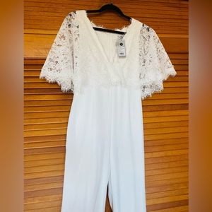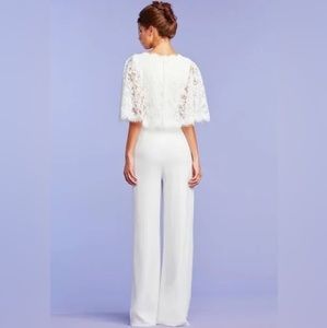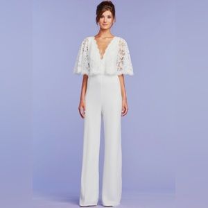 Brand new , Tadashi Shoji - crepe and lace V-neck jumpsuit has an attached capelet that hits just above the waist for an ultra-flattering fit and an easy fitting, wide-leg pant. Size 0/2. Original price $508