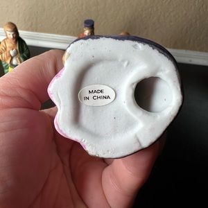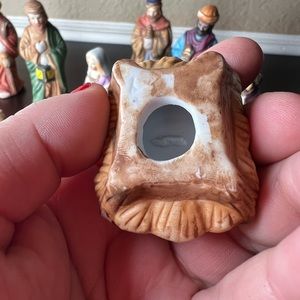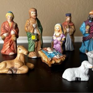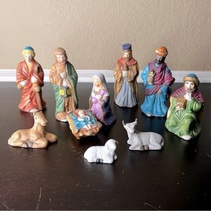 Vintage 1990’s Creche’ / Nativity 10-piece set. Set includes mother Mary, Joseph, and baby Jesus in a manger. The three wisemen are here with their gifts. The innkeeper looks on with his glowing light, and three animals are included, a cow, a sheep, and a horse. Small to medium size set can be displayed on a ledge or Windowsill or a mantle. All pieces are made of ceramic. The pieces have lots of jewel tones, which was popular for Christmas decor in the 90s. Stickers on bottom “made in china”.