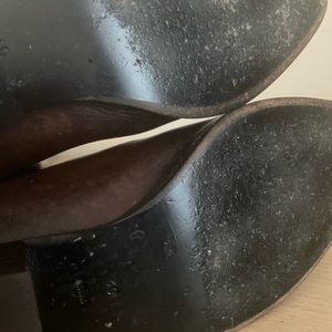Pointed toe; tonal topstitching.