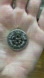 From Brooklyn jewelry designer Liz landers. Many of her pieces are made with antique buttons. This is an antique button set in sterling silver. Pendant is inscribed “antique button” “Liz landers” “silver”. Measures a little over an inch around.
