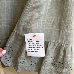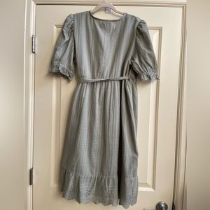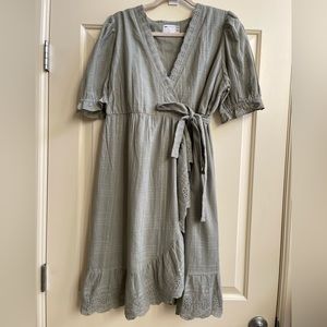 Sage green wrap dress with eyelet lace ruffles. True wrap style so the waist is very adjustable! New with partial tags.