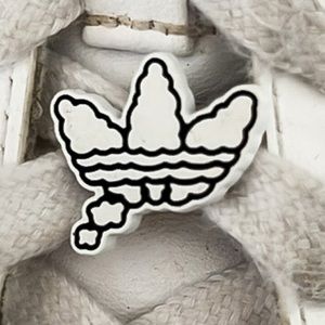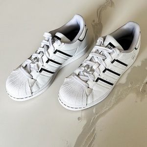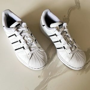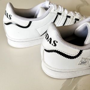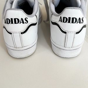 Adidas Superstar Shell Toe White and Black Striped Sneakers. Adidas fun cartoon details throughout. Lace up closure. Pre-owned condition. Please see all detailed photos provided in listing. Big Kids Sz 4