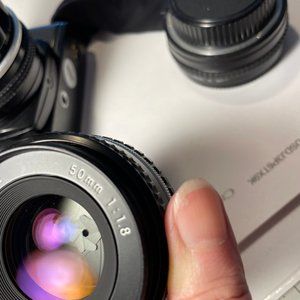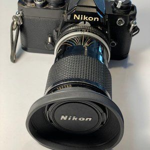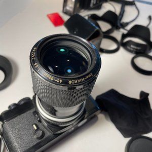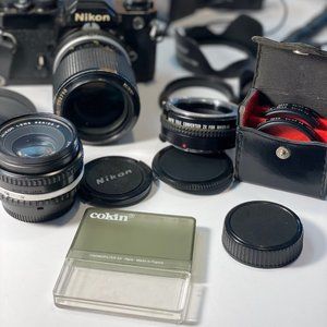 Classic vintage Nikon FM (fully manual) film black body camera with Nikon 50mm 1:1.8 lens & Nikkor Zoom 43-86 1:3.5 zoom lens and many filters & lens hoods, remote triggers & Achiever bounce flash unit. I haven't used it in decades, but it seems to sync fine. Uses 35MM FILM.