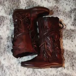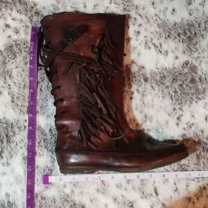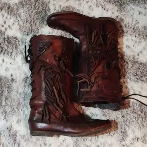 Stunning pair of genuine leather boots! Tons of unique details! Adjustable laces up the back! Adjustable buckle crisscross calf strap with braided detail! Fringe down both sides! Braided detail along toes! Gently worn and well cared for! Excellent condition! Recently conditioned and waterproofed! Size 38 EU, would best fit 7.5-8 US.