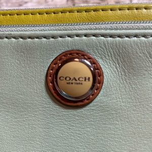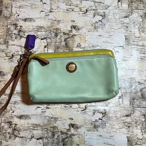 Leather coach wristlet. Could use a cleaning, but I’d overall good condition. Some light wear. Light greenish color with yellow accent and purple tag. Most phones can fit in the outer pocket, leaving plenty of room for cash and cards in the main pocket.