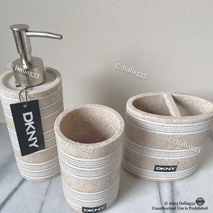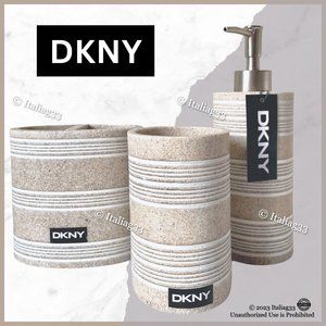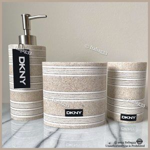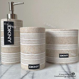 ~ Bring the beach indoors with this beautiful and neutral DKNY bathroom 3pc accessory set! Featuring a gorgeous sand/stone-like speckled design w/ accented white stripes, this set is very versatile & will be sure to look great in your home! ~