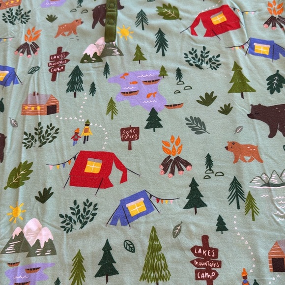 Featuring fun camping details like cabins, friendly bears, campfires, tents and trees, this Happy Campers print is certain to provide a happy night's sleep!