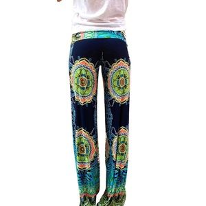 Uptown Apparel Fold Over Waist Wide Leg Palazzo Pants. These pants can be worn with high waist or folded over. Beautiful, unique print. Raw unfinished hemline made to cut shorter in length if needed. Note: Length varies from 33.1/2″ to 35”, depending how much you fold the waist down. Made from a lightweight blend of polyester and spandex, these are the perfect weight for the spring and summer months. The extra long length is perfect for taller women, but can be cut shorter or hemmed as needed. Harems Trousers, Long Pants, Wide Leg