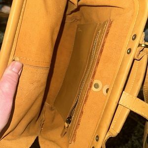 Hundred percent real leather over the shoulder or hand, held medium sized corn, flower colored three pockets middle full size lots of room gently used no damage like new