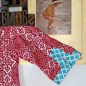 • Turquoise on white trim at neck, on sleeve hems, & on
