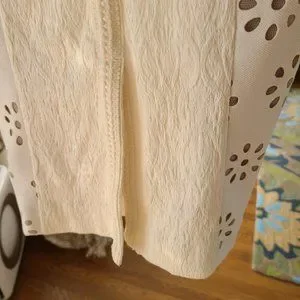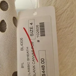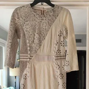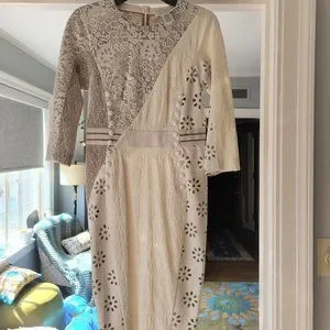 Rare, NWT! Bryon knows how to drape a dress to accentuate a woman's body. This gorgeous dress hits below the knee with 3/4 sleeves and has creamy white leather look fabric, laser cut design, illusion lace, and cute button details.