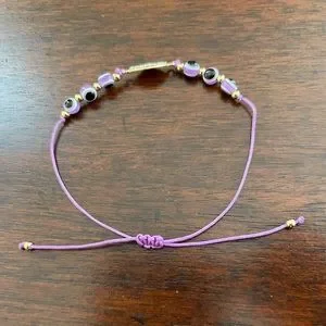 This is a super cute “ward off evil eye” purple bead gold tone adjustable bracelet It will fit all wrist sizes. New without tags.