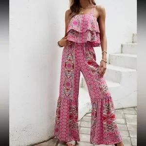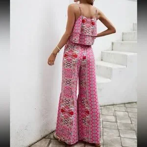 Boho Floral Paisley Ruffle Print Wide Leg Palazzo Pants Crop Cami Top Set Pink