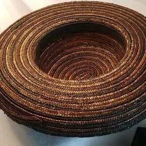 This is a beautiful heavy straw hat of light brown and black stripes with 3 1/2" brim and a totals 16" wide.