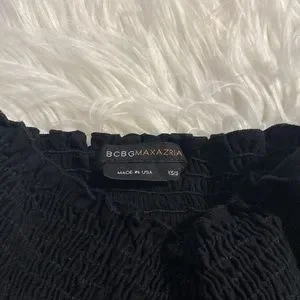 BCBG black strapless tube top. Upper half is smocked. Looks so flattering on the chest. Has an adorable baby doll fit.