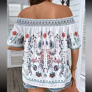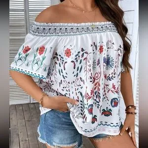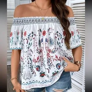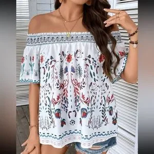 Boho Floral Print Off Shoulder Top Blouse Shirt White