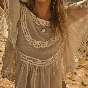 FREE PEOPLE I’m Pretty, OK Lace Mesh Tiered Ivory Top SZ L NEW!!!