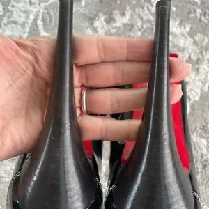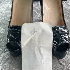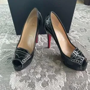 Black patent Christian Louboutin peep toe stiletto heel. Excellent condition as seen in photos. Only worn 3 times.