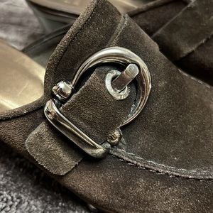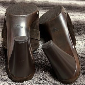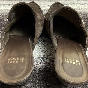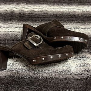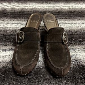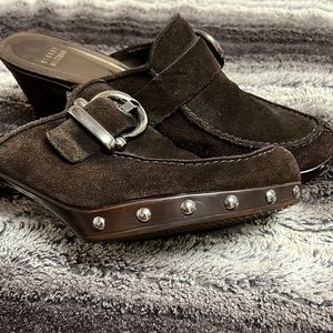 Stuart Weizmann Brown suede buckle studded clogs