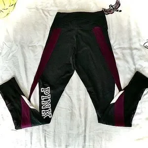 PINK by VS XS leggings Dark Gray Burgundy White fishnet & hidden pockets EUC