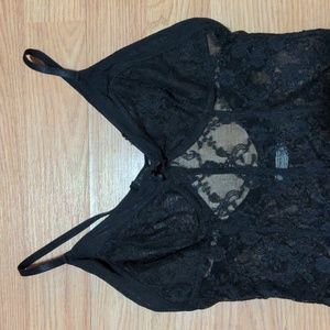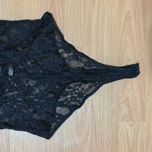 This is a super sexy bodysuit that is fully lace. It has cross-crossing spaghetti straps in the back that are adjustable. It is lined at the bust, but it is still semi-sheer. Pair with high-waisted jeans, shorts, mini skirts, etc. It is in very good condition.