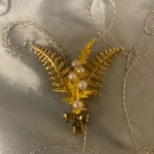 . π πEstate piece, which weighs 6.7 grams. It is in EUC. This would have been a high-end piece well taken care of. It is 3 strands of fern, with lifelike detailing, wrapped in a contrasting white gold bow. The clasp and 5 pearls are both in excellent condition.