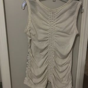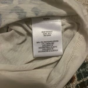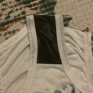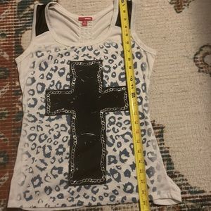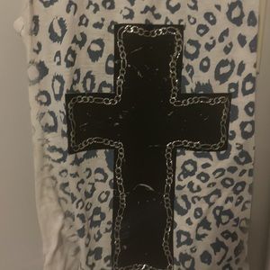 Leather look detail on top shoulders, cross on front, blue black white silver