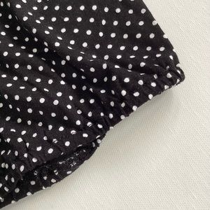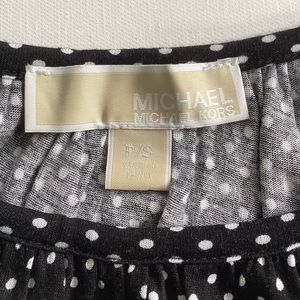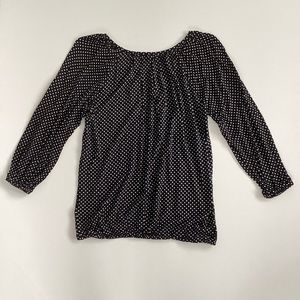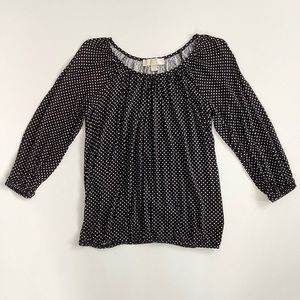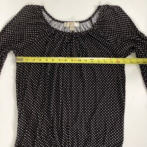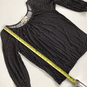 Black top with white polka dots. Peasant top style with the neckline and blousy elastic hem. 3/4 sleeves. Brand is Michael Michael Kors. Measurements included in pictures. Smoke free/pet free. I’m happy to help with questions!