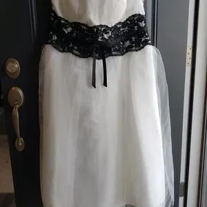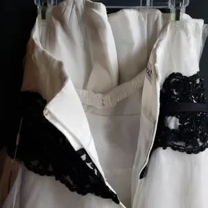 Formal plus-size 18 white dress with layers and layers of white tulle, accented with an appliqued black lace empire waist trim and NEW matching custom bolero jacket with long, lacey sleeves and satin placket for coverage.