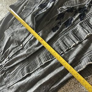 A prairie dress by COACH is expertly tailored with cotton chambray fabric and symmetric floral insets at the neckline. The stand collar is detailed with tight pleats, which are mirrored at the bib feature and short sleeves. The tiered hem pairs perfectly with low heels or a pair of tennis shoes.