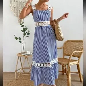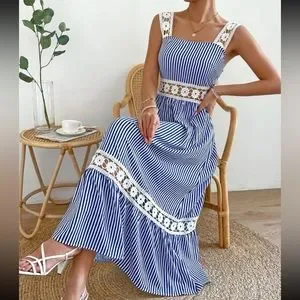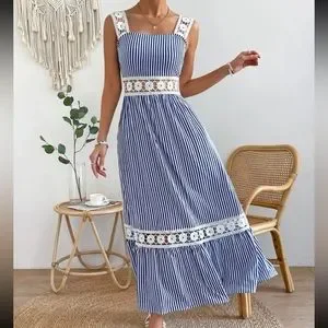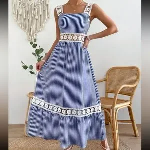 Boho Stripes Floral Sheer Mesh Lace Tiered Cami Maxi Dress