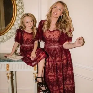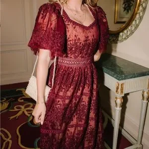gorgeous marchesa print lace fabric in deep red burgundy with short sleeves and cream lining, perfect for wedding guest christmas