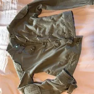 Fun RETRO RAG DOLL BRAND 80s jacket in a tan color. Fun clasps out of metal. Patches on shoulders and elbows. Size is small RARE fun fun!