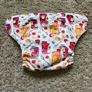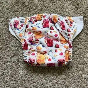 Mama Koala jam / jelly / berry print cloth diaper. Adjustable to fit babies 8-35 pounds. Includes 1 pocket diaper and 1 microfiber cloth insert. Microfiber cloth has snaps to adjust length, as well. Diaper has a soft and stay-dry suede liner; has a large back pocket opening that is easy to stuff with insert and has enough room to add an extra insert for overnight protection.