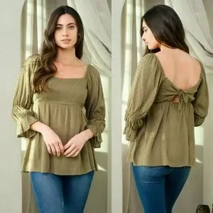 NWT Boutique item. 3/4 Puff Sleeve Babydoll Swiss Dot blouse with open back. Multiple sizing options available: small, medium, and large. Model is wearing size S Length: 27" Bust: 32" Waist: 13". 100% Rayon Lining: 100% Polyester.