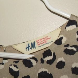 You are viewing an adorable dress from H&M in size 6-7. This sleeveless dress has a tan base and leopard print pattern. It is accented at the bottom with a subtle pleated 'shirt' design and also has a small keyhole opening on the back at the button. The dress is lined. It was only worn twice and is in great condition. No holes, stains, or snags were noticed during inspection.