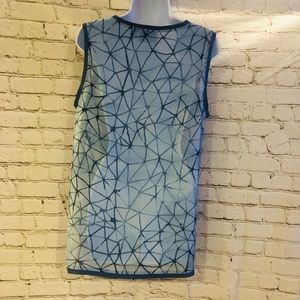 Here is a beautiful geometric print sleeveless top in different shade of blue in a size large by “VERA WANG”. This looks beautiful with a skirt, jeans, shorts, or even a cover up at the beach!