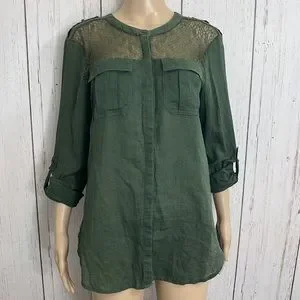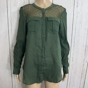 Free People Green Linen Cotton Blend Long Sleeves Army Green Top Lace Bodice