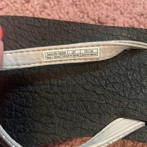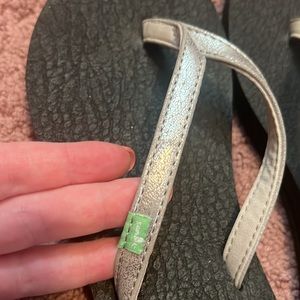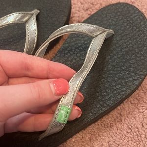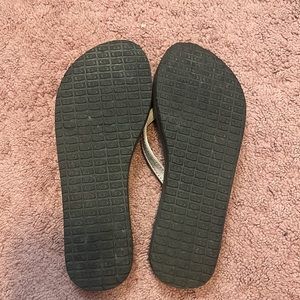 Silver metallic thongs, Women’s size 7, yoga mat bottom, worn handful of times so EUC, straps were a little too tight for my foot which is the only reason I am poshing. Any questions, please ask!