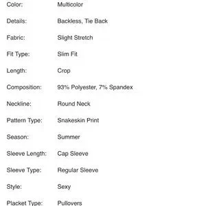 BACKLESS SNAKE PRINT PATTERN TOP IS STYLISH & CUTE! CUTENESS MEET SEXY AND CREATED THIS TOP!SIZING CHART IS LAST PIC